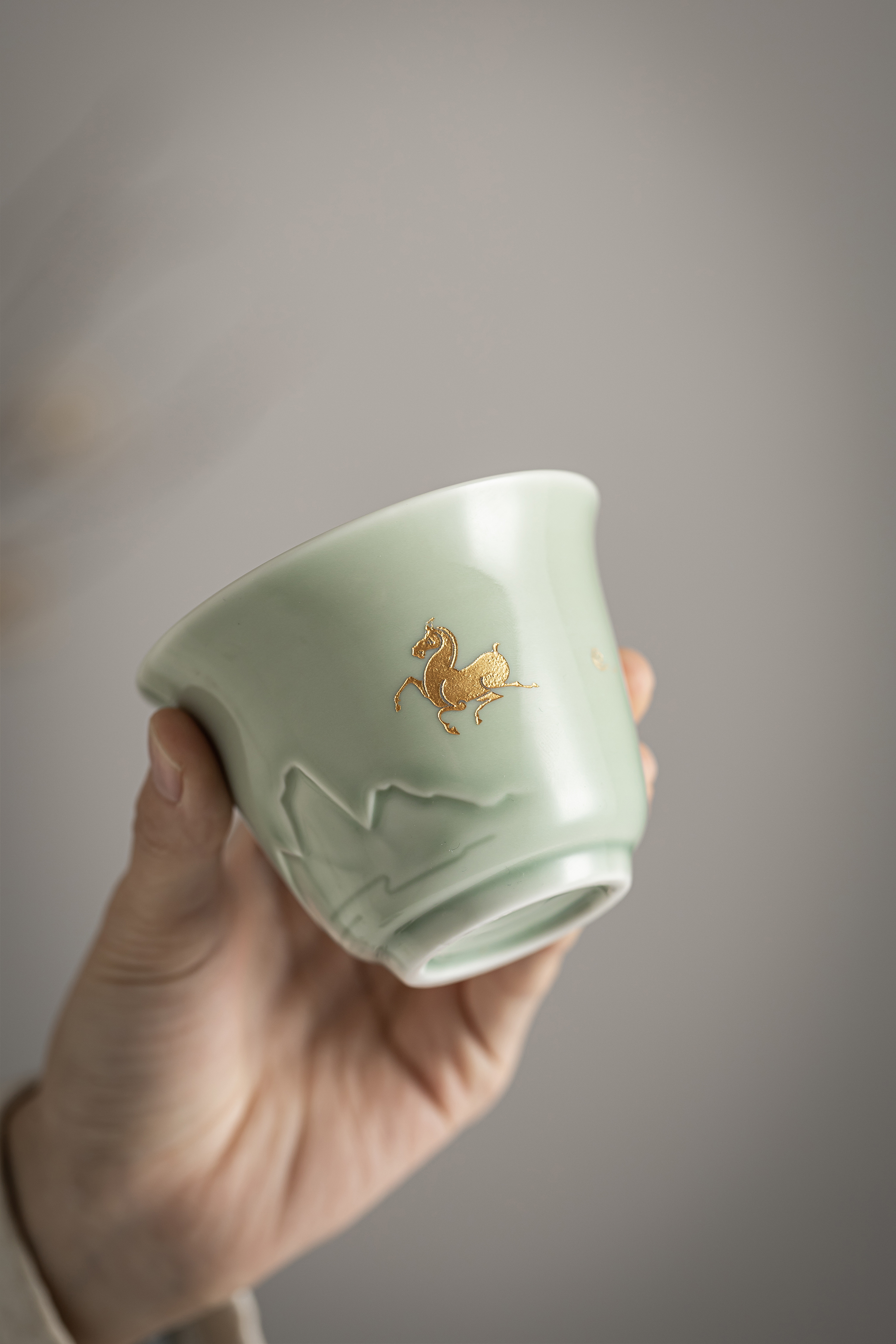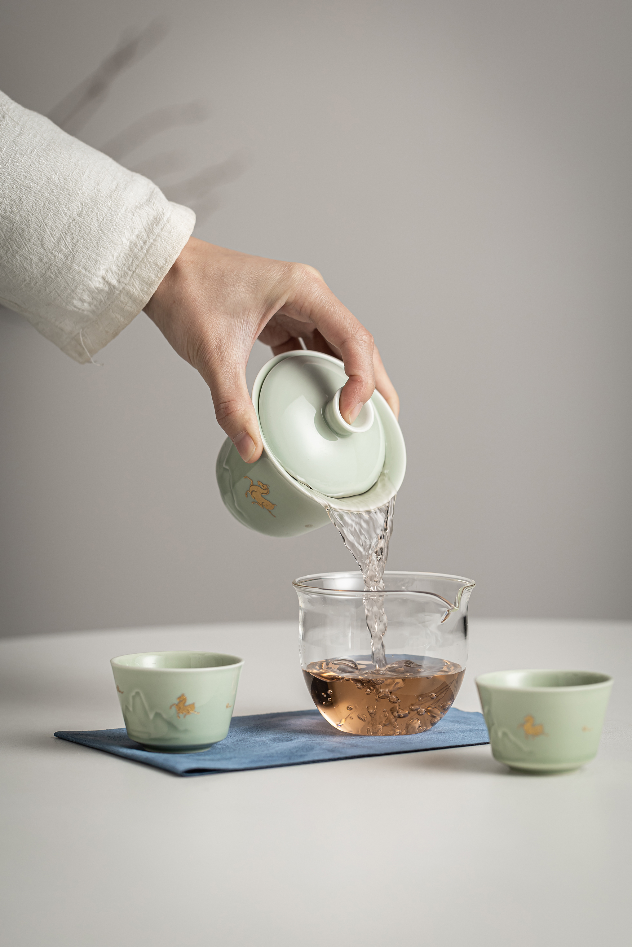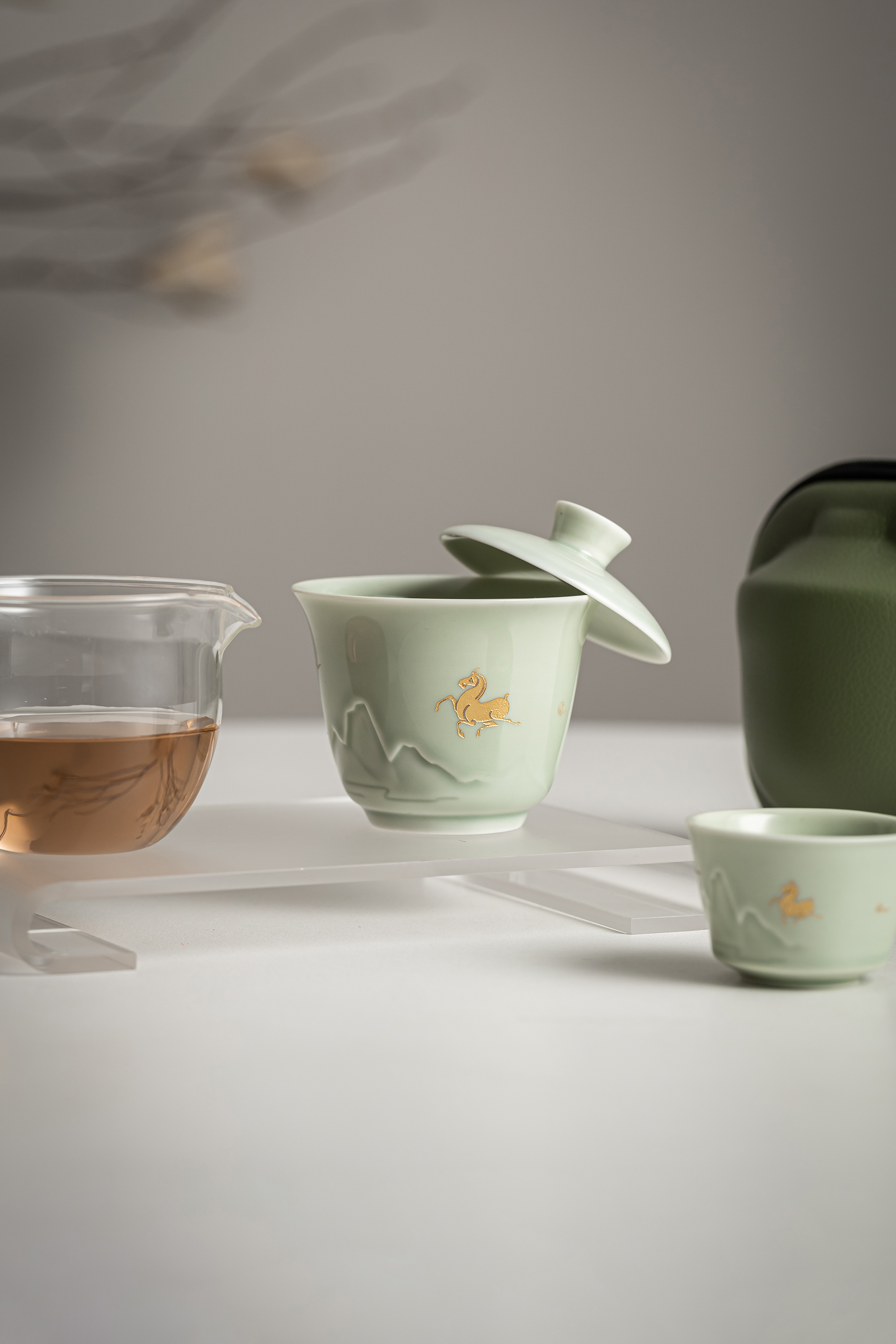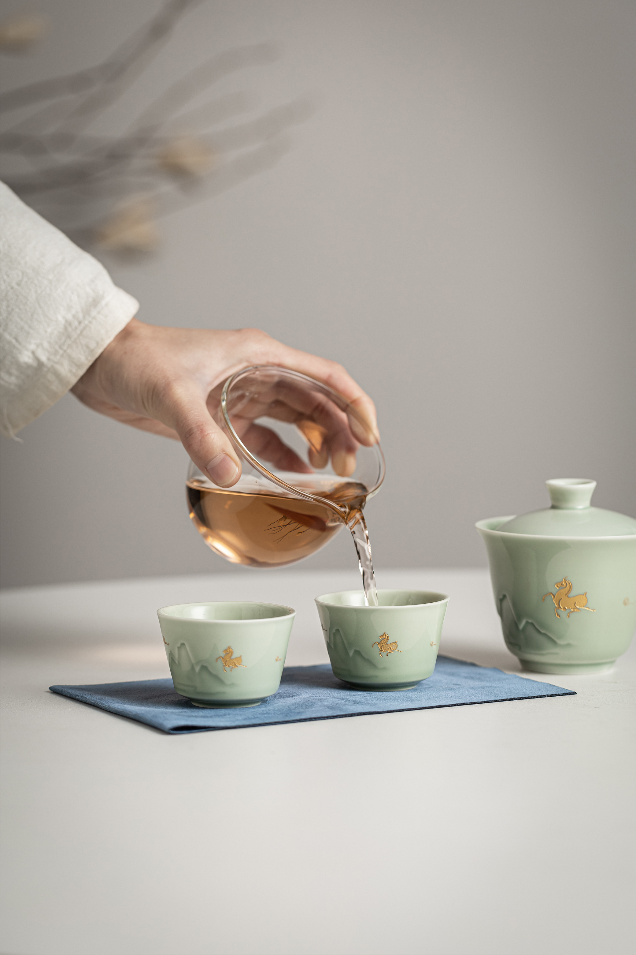 This refined set includes a celadon gaiwan adorned with commemorative gilded galloping horse motifs, two matching cups, a glass fairness pitcher, and a tea towel. All nestle perfectly into a compact faux-leather case, now featuring exclusive subtle embossing and elegant gold-tone hardware details.